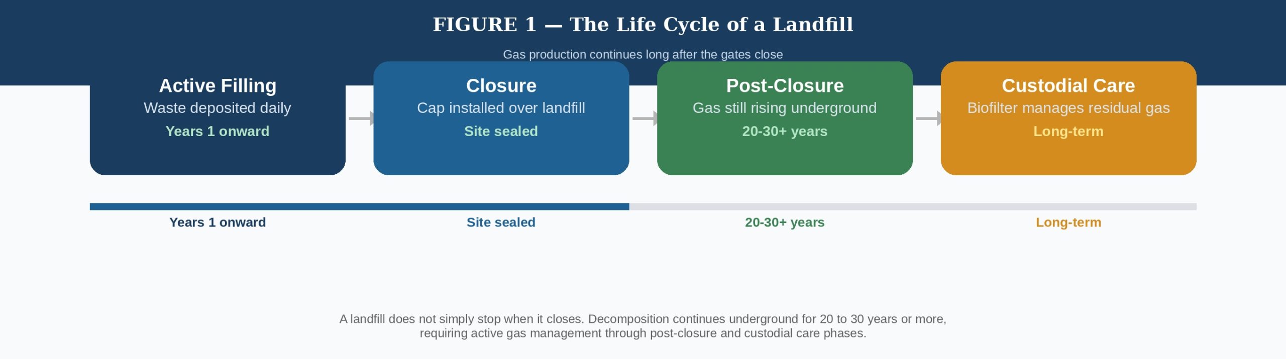 A figure detailing the lifecycle of a landfill: Active Filling, Closure, Post-Closure, and Custodial Care